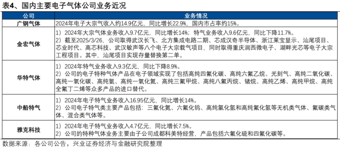 ①电子气体是集成电制制、半导体显示中不成贫乏的环节材料,被称为电子工业的“血液”和“粮食”,此中又具体分为电子大气体和电子特气。正在集成电制制范畴,电子气体占总成本比例约13%,是仅次于硅片的第二大需求,此中大气体和特气用量比例别离约55%/45%。跟着AI带动半导体需求迸发,估计2030年中国电子气体市场规模将达298亿。②电子特气品类很是多,单一品种仅正在半导体出产的部门特定环节利用,一般环境下,单一供应商仅能供应数种或数十种特气,因而行业参取者较多,行业款式分离。目前国内自从出产的电子特种气体市场份额占比仍然较小,据中国工业气体工业协会统计,我国仅能出产不到三成的集成电出产用电子特气品种,呈现高端产物产能不脚的特点,进口依赖度仍较高。③跟着下逛存储景气、稼动率提拔带动存量晶圆产能气体需求抬升,两存IPO带动新增项目扩产预期升温,电子气体全体景气宇向上。正在光刻机国产进度加速、海外电子特气产能退出(如三氟化氮)、原材料跌价鞭策产物价钱上涨(如六氟化钨)等多沉催化下,国产电子特气公司合作力无望进一步彰显,加速国产化历程。