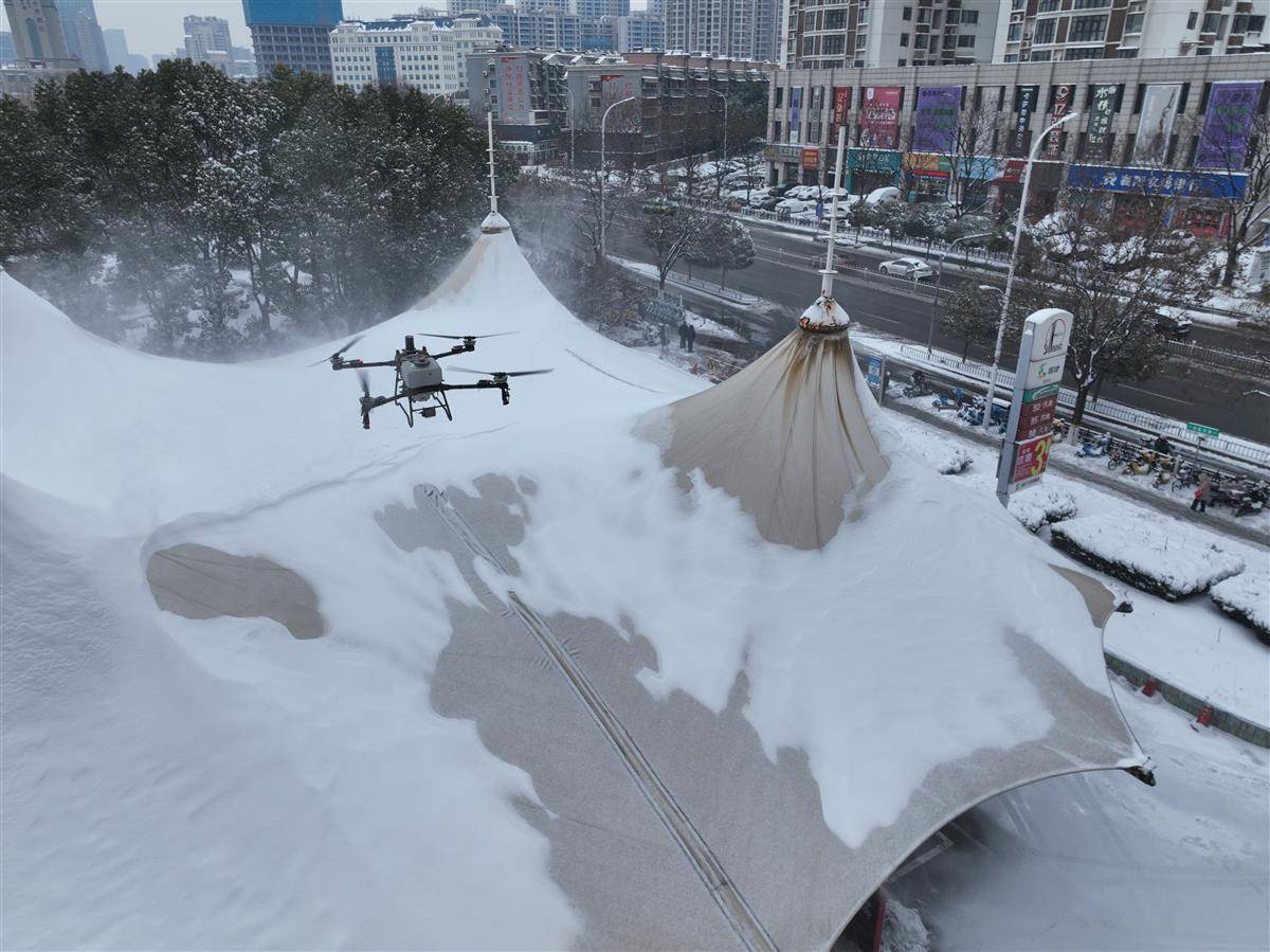 面临永嘉加能坐斜拉膜罩棚因积雪可能激发的平安现患,无人机悬停正在罩棚半空,双螺旋桨发生的强劲气流如无形扫帚,仅用1个小时便将400平方米罩棚积雪清扫一空。这种立异的除雪体例,又提拔了多倍的功课效率。正在积雪较多的襄西等坐,还请来铲车,帮帮铲除积雪,为加能坐平安运营保驾护航。